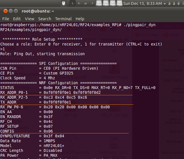 The example that we will consider here is 'pingpair_dyn.cpp', present in '/RF24/examples_RPi' directory. What this Application does is, it Transfers and Recieves Payloads of varying(Dynamic) sizes. It sets up Radio Pipe addresses, to set up two Nodes/Pipes, one for Transmitting and the other for Receiving. The Application asks user to sets up the Role, as Transmitter or Receiver, and Transmits or Receives a chain of characters every time, in a continuous 'while' loop.